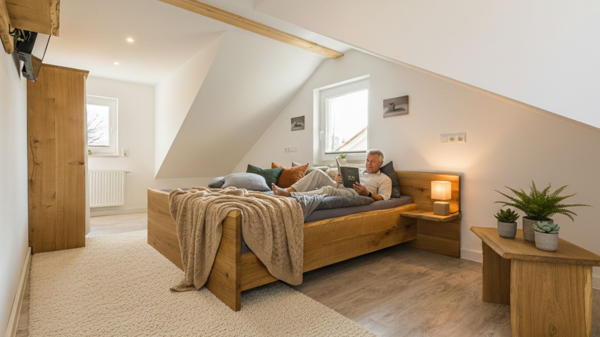 Dachschrägen und Möbel aus massivem Eichenholz sind ein echter Blickfang und werden von abgestimmten Accessoires harmonisch ergänzt. Beide Schlafzimmer sind mit einem Fernseher ausgestattet. Elektrische Rollläden helfen dabei, seligen Schlaf zu finden.