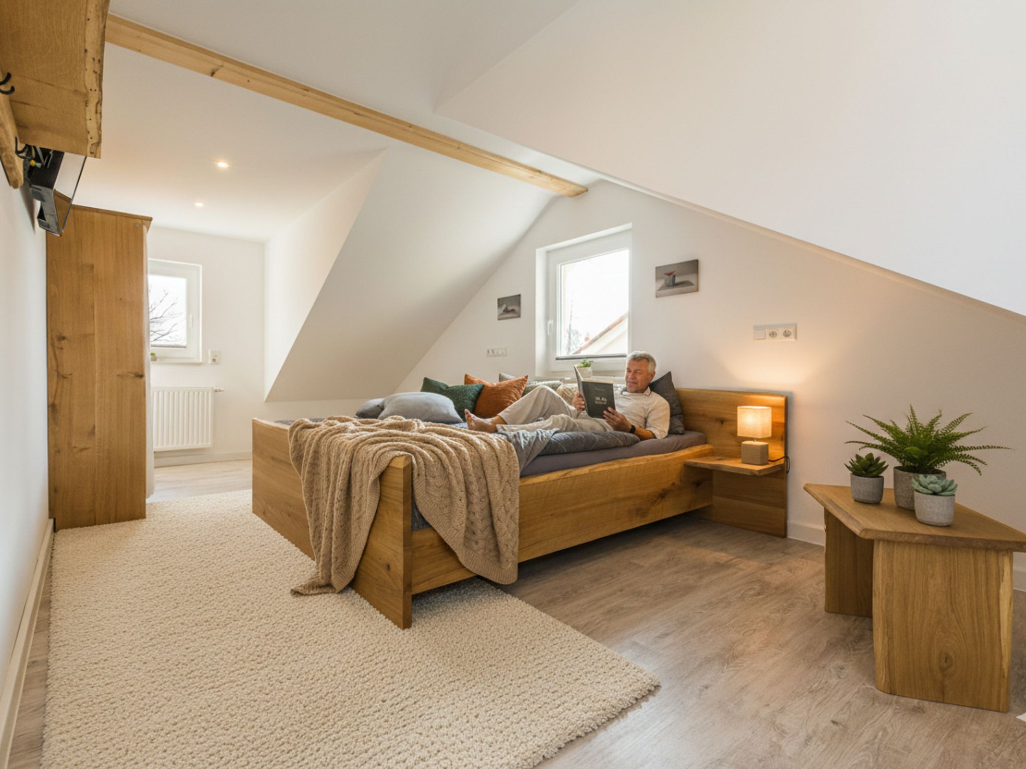 Dachschrägen und Möbel aus massivem Eichenholz sind ein echter Blickfang und werden von abgestimmten Accessoires harmonisch ergänzt. Beide Schlafzimmer sind mit einem Fernseher ausgestattet. Elektrische Rollläden helfen dabei, seligen Schlaf zu finden.