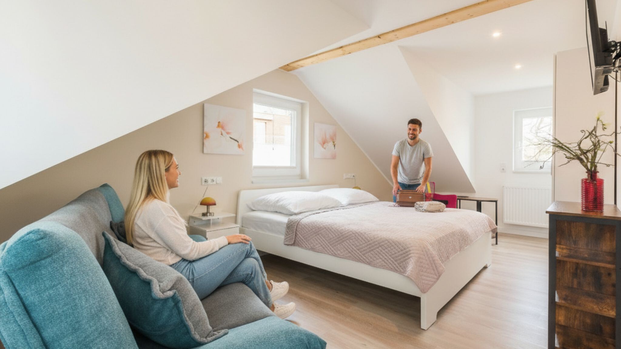 Hochwertige Betten und elektrische Rollläden versprechen erholsamen Schlaf und geben den Räumen eine zeitgemäße Note. Beide Schlafzimmer sind mit einem Fernseher ausgestattet.