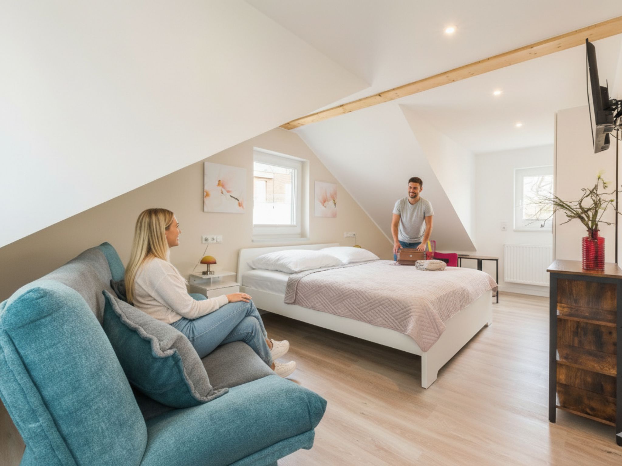 Hochwertige Betten und elektrische Rollläden versprechen erholsamen Schlaf und geben den Räumen eine zeitgemäße Note. Beide Schlafzimmer sind mit einem Fernseher ausgestattet.