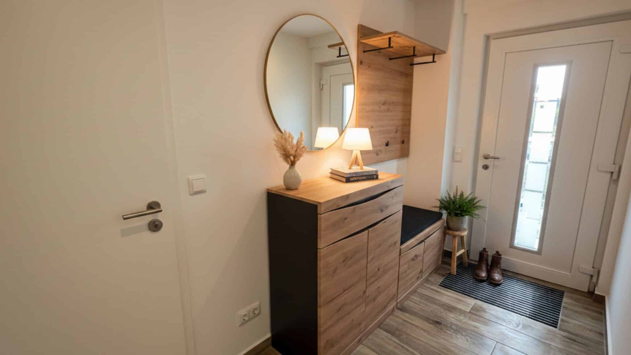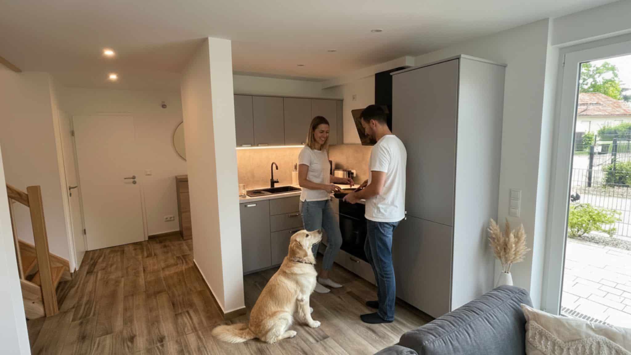 Blickfänge in diesem Raum bilden ein großer Esstisch aus Naturholz für 4 Personen, der sich unweit der modernen, offenen Küchenzeile befindet, welche mit hochqualitativen sowie praktischen Lösungen aufwartet.
