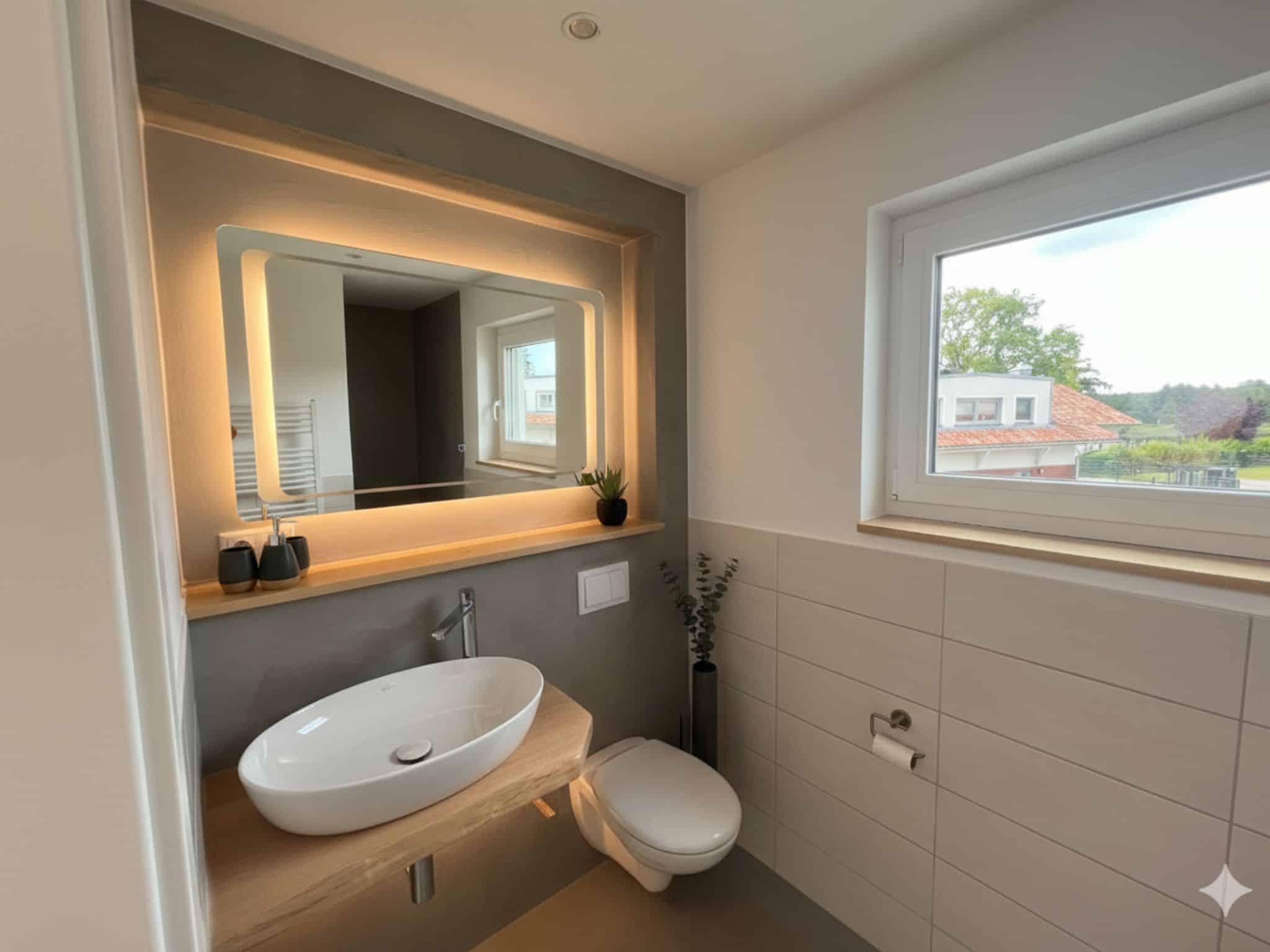 Funktionalität und Ästhetik bestimmen den Ton in allen Bädern. Ein wahrlicher Genuss ist das Entspannen auf der großen Dachterrasse mit freiem Blick über den Altdorfer See.